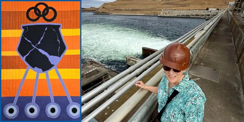 Here, we go behind the exhibit to learn more about its curator, local artist Lindsay Olson (pictured above, along with her quilt “Dry Wells”).